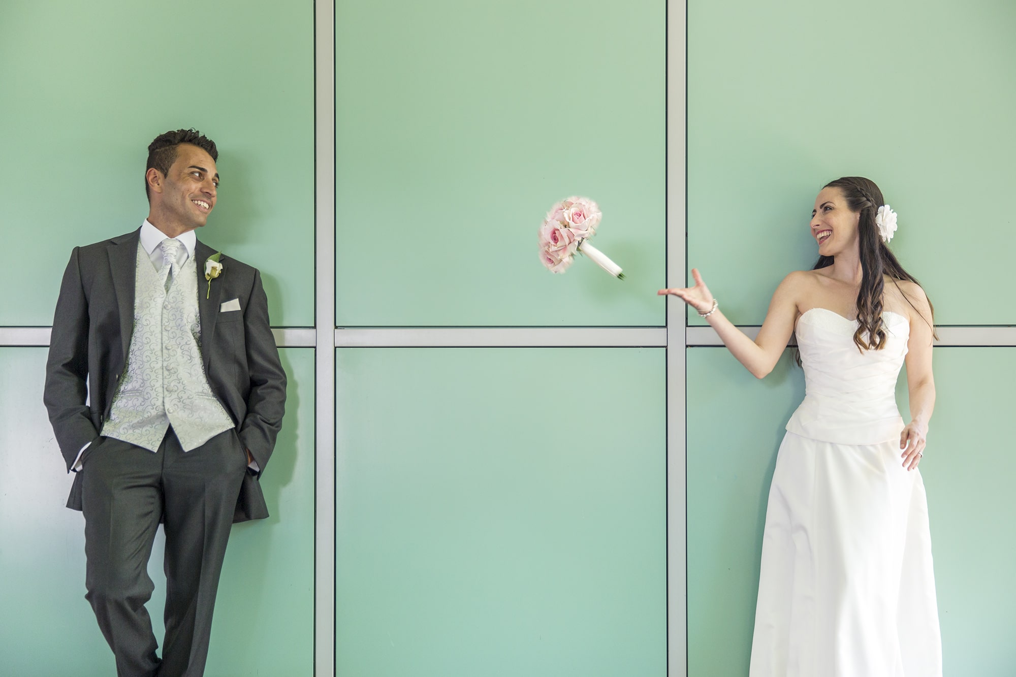 Bride tossing bouquet to groom