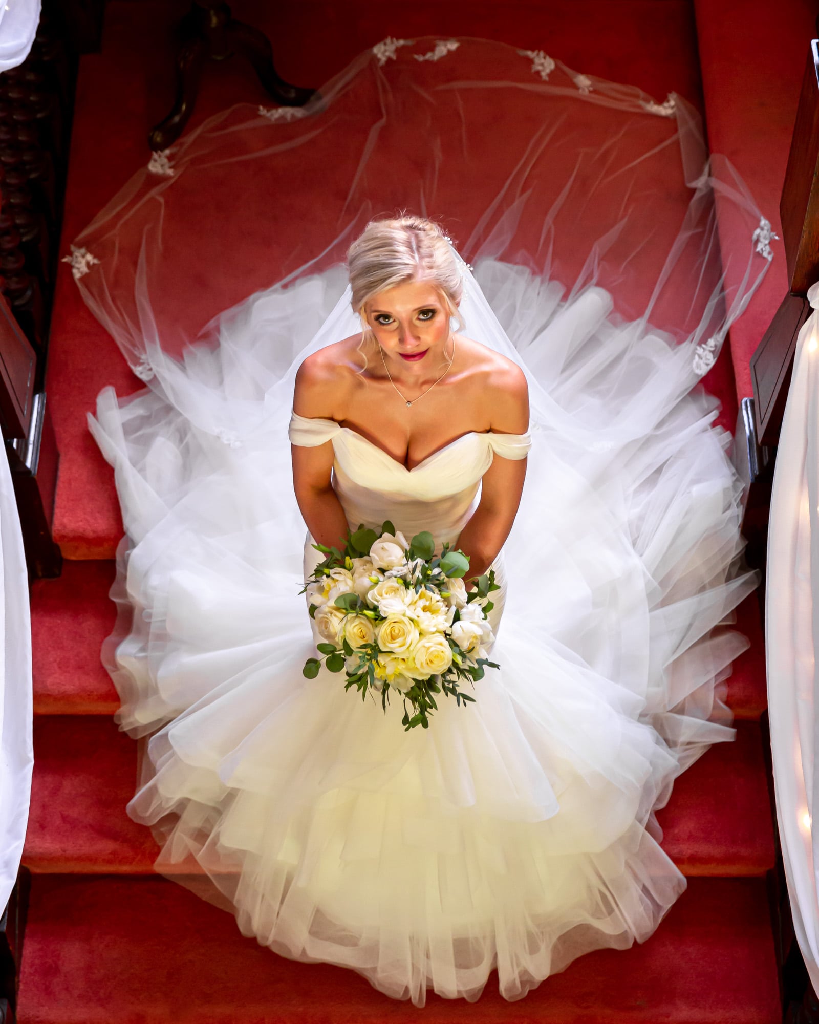 Bride on stairs looking up