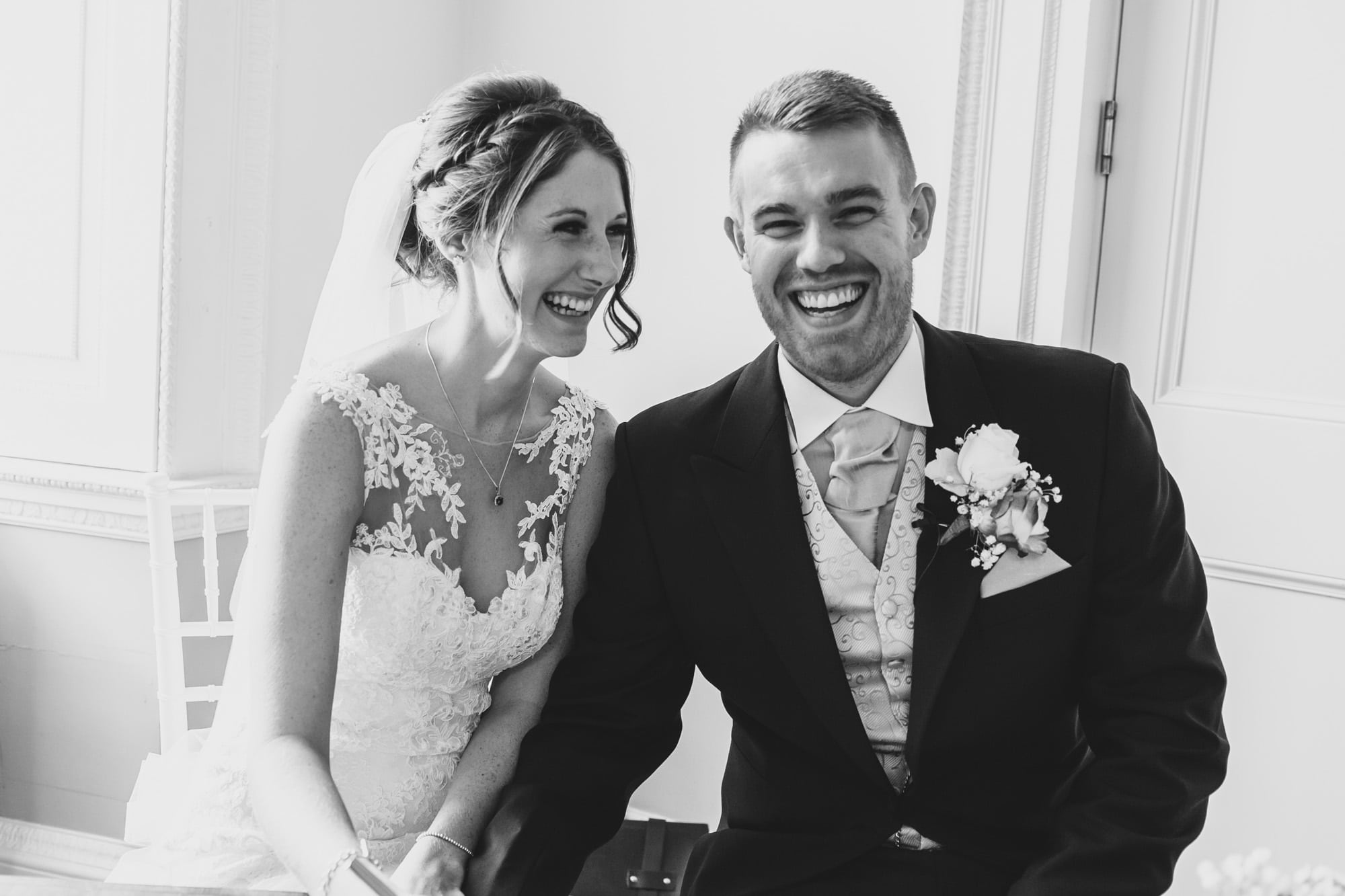 Bride & Groom laughing after signing the register