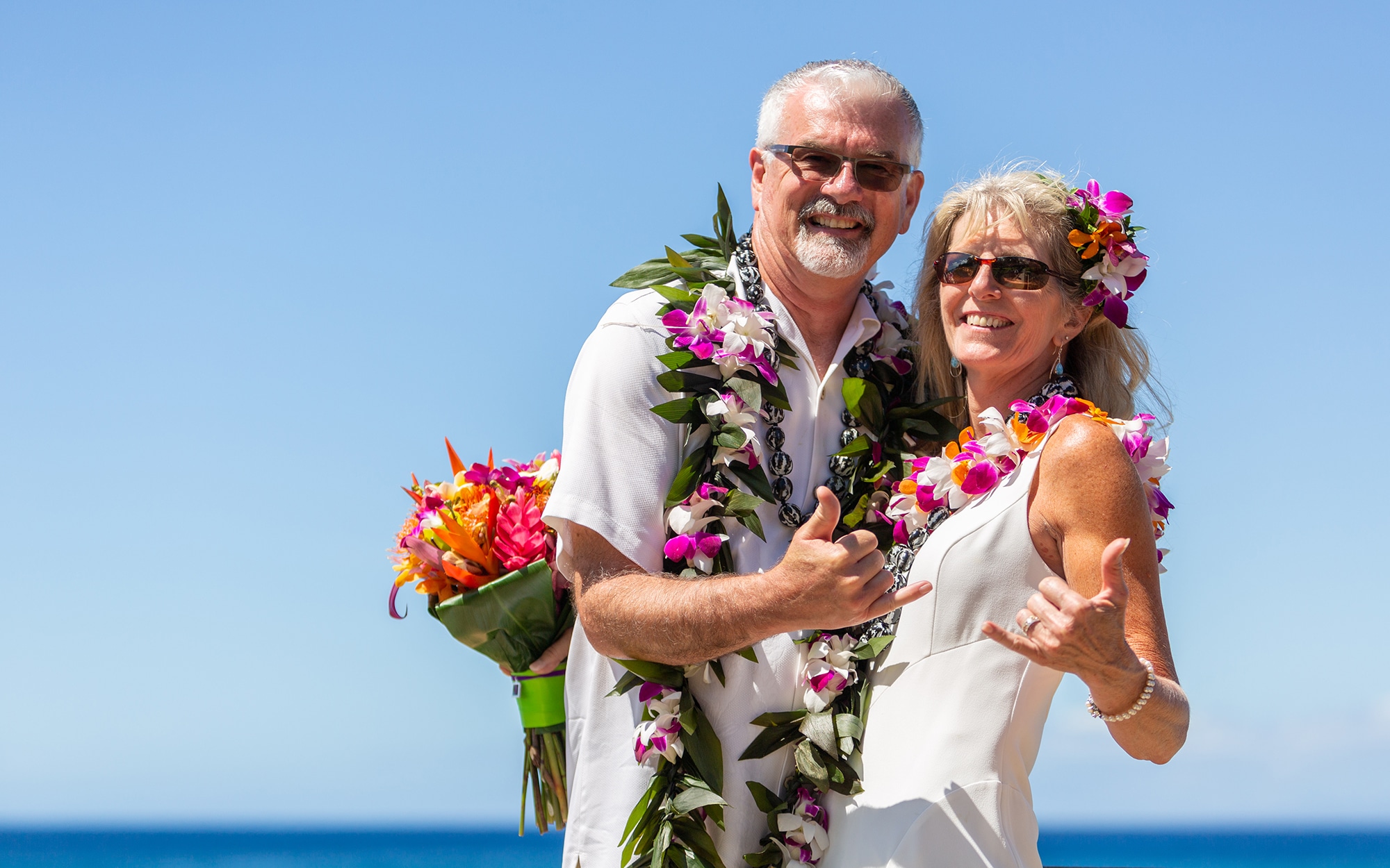 Bride and groom in Maui with leis